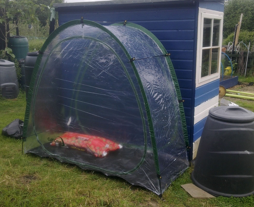 The things I have done – potted on seedlings and germinated 15 sweetcorn for a plot neighbour whose seedlings carked it, mooched about the plot looking dismally at how much further ahead others are and put up the culticave. That in itself was a bit of a disappointment as it’s got several cuts in the plastic. I’ve written to the company and hopefully it can be sorted out.
