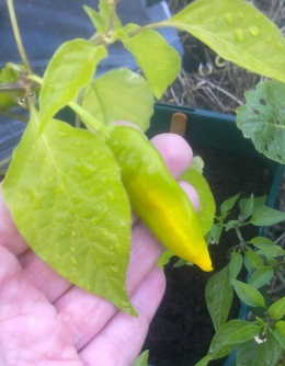 Woo-hooo! I have an aubergine flower! Just when I was giving up on them too. So back into the cave they went last night, and the cape gooseberries are now outside in my Pot Paradise with my overspill chillies, rhubarb, blackcurrants and lovely, lovely horseradish. A few of the lemon drop chillies are developing bright yellow streaks….oooh the anticipayshun!