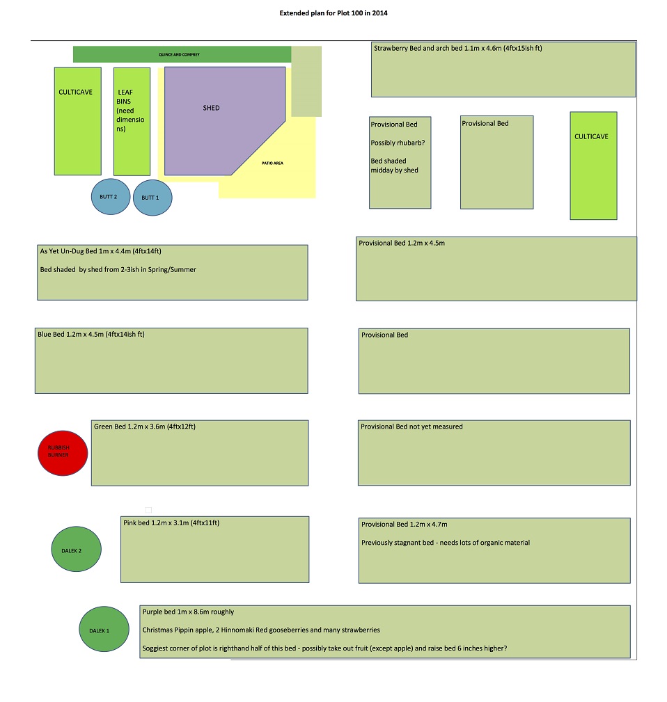 I’ve also done some better measuring so I can ponder over plot plans in the winter evenings. This is my latest effort. The shed’s at the west end of the plot, the long bed is at the east end and a 6ft hedge runs along the south border. The plot isn’t square, and I have no snazzy drawing programmes, so this is the best that I can do in Excel. It’s pretty much to scale – side paths are mostly 55cm wide and the centre path will be 80cm wide – all woodchip as looking after grass is a proper pain.