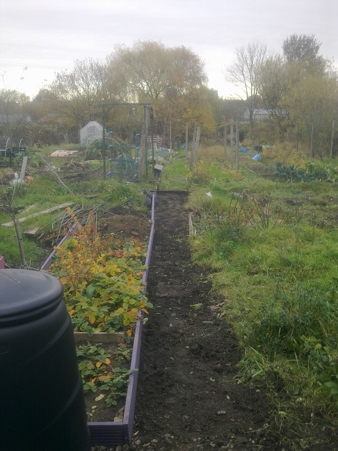 My friend Michelle says to break the digging down into chunks so … I reckon I should try to gradually dig and woodchip the paths plus the culticave area over winter. AND mark out and cover the beds-to-be. I’ve ordered a 50m roll of heavy-duty weed stuff from fleabay which should hopefully see me through all the remaining paths. (I wish I’d overcome my auction-site technophobia earlier – it would have saved me a fair bit of cash on shoddy weed fabric. ) That should take me to about March/April, unless I can draft in helpers. Through both Springs I’ve had the plot the beds aren’t really diggable till May.