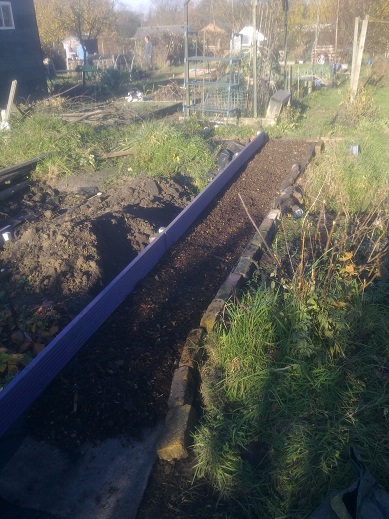 Lionel lent me a riddle to sieve some of the worst stones out of the dug bits. That man is kindness personified. But I changed my mind about using the soil after I a) smelled it, and b) looked properly at the weeds to soil ratio. I am instead stashing barrow loads of weedy, stoney yuk either into the hedge or on top of the pile that the last work party scraped off the car park. That pile’s so huge my additions aren’t noticeable. Though successfully running a loaded barrow up a plank to the top is not yet something I do well/consistently. Our Chair said, in all seriousness, ‘someone might want to use that topsoil on their plot’. I stifled snorts and looked carefully at my boots. I know how much horseradish, couch, thistle, bramble and dock root there is lurking in there…not to mention the stones.