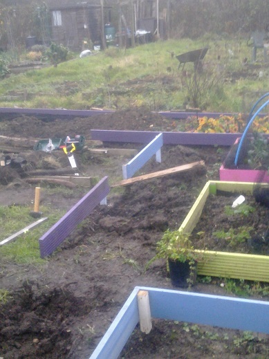 Right, started on the main path. The new beds on the left are to be level with the ones on the right and there really is quite a slope. I’ve got lots of old timber I can cannibalise to provide extra height, and bags of soil from the paths that I can use to top up too. Current colour order is blue, purple, pink, green. Though this might change…