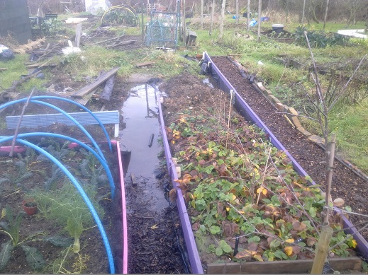 Today I are mostly…squelching about & setting up water butts. I also took some snaps of the informal pond that is my plot. Will definitely think about digging some form of trench/pond over the next few weeks.