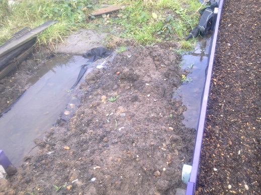 Not a big one, because it sends some of the water down the north edge of my new neighbour-to-be, but enough to mostly drain the moat that was the lower path. The stuff under the water is thick with slimy algae. In the search for silver linings, I am glad that there is an old road running down the south side of the plot, because now I have enough stones to fill the longer length of the soakaway if/as I dig it further up.