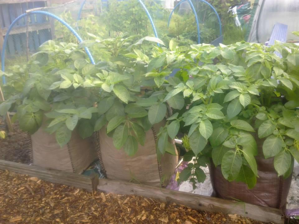 Spuds inna bag have become ENORMOUS plants – I’ve not had this result before and am really pleased. All are on the verge of flowering and have been in the bags for 8 weeks (9 for the Charlottes). The Desiree look like they will be first to flower. Not sure whether it’s worth earthing up more at this stage – I meant to put more compost in and they’ve caught me a little by surprise.