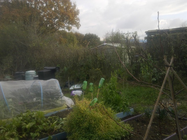 Fab session at the plot until the rain set in. I went up via the German bakery in Ham to get some rolls and a piece of cake to go with my coffee. It was all misty in Richmond Park, with deer poking their heads up through it. Beautiful.