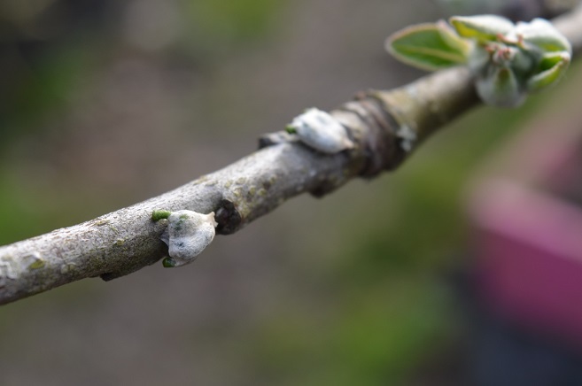 I also had an hour or so on #100, watering pots, checking things over, finding more of my pea seedlings scattered about from the storm. Discovered the mistletoe seeds have legs! It looks like they are taking on both the blackthorn as well as the apple.