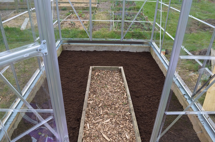 Hooray, hooray the greenhouse is done. I’ve dug and turned over the claggy clay to a spade’s depth and removed a big tub of bramble roots and buttercups. To enrich it a bit and have it completely ready for swathes of tomatoes I’ve added a few bags of rotted manure, some lime, some supagro and a bale of compost and then covered it all till planting time in case I’ve missed some ‘orrible weedlings. Remembered afterwards that lime and manure aren’t really supposed to go in together. Ah well.