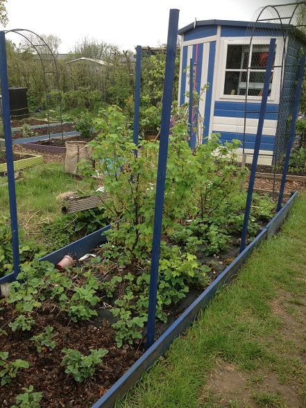 Still, a fair amount’s been done on plot 100. Parsnips are go – 30 holes made in the navy bed with my hoe handle and filled with moist compost (top tip – use a jam funnel to fill the holes, it’s genius!) with 3 seeds of White Gem per hole. Radishes are in and so are some early marigolds, and the potatoes planted on 4th April are starting to break through the ridges. Fluffed the soil in the gooseberry bed by hand – it’s intensely satisfying to run my hands through the soil and break up the clay clods, if not the most efficient use of time.
