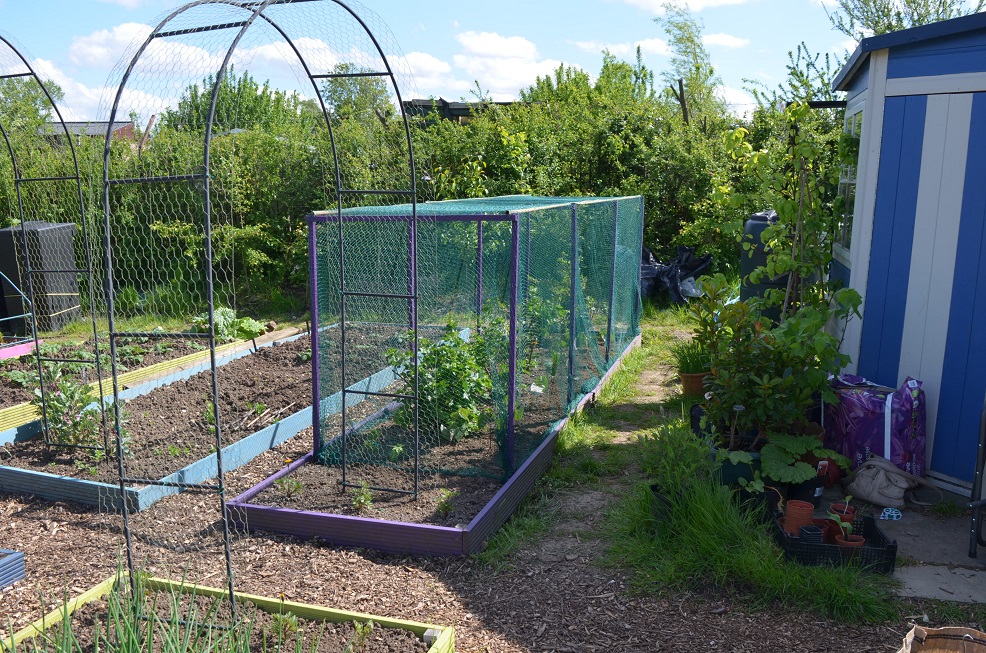 Most of my time has been spent on my ‘home’ plot. I noticed the pigeons were having gooseberries for breakfast, so the fruit netting came out at high speed. I now have a second fruit cage in a lovely shade of purple and a hoop construction down the bottom.