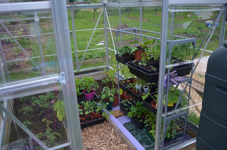 After some much-needed advice on greenhouse planting from Lionel I’ve planted out 11 tomatoes so far, 7 on the left-hand side with 3 Lipstick peppers and 4 aubergines at the top end. The tomatoes are each sitting on a length of (pink) poly twine which is tied to a horizontal cane up near the rafters. In theory, you twist the tomatoes around the twine to keep them growing straight, and the roots of the plants anchor the twine in the ground.