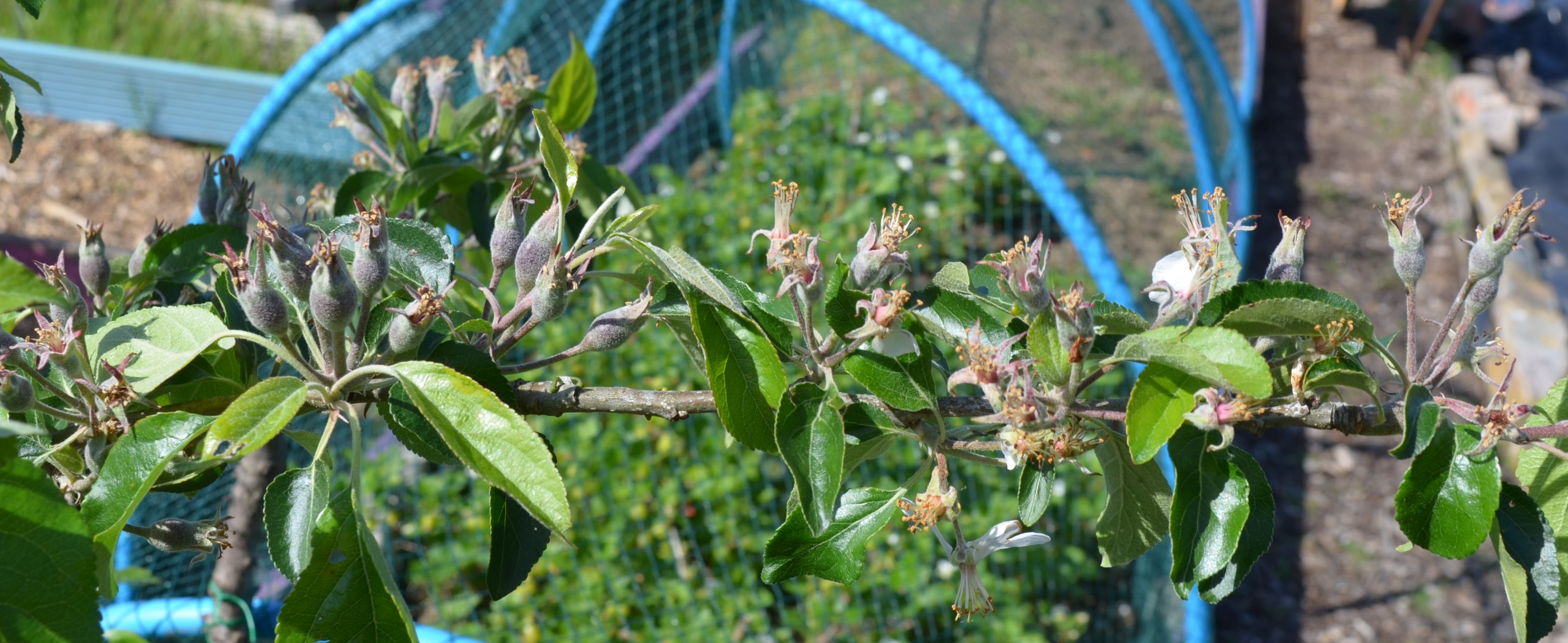 The little apple tree was completely bent over and resting on the gooseberry netting. I think I need to put in a taller stake for it, the 3ft one just won’t do any more. I have snipped off just about a third of the baby apples and hopefully some more will drop this month because I think it is carrying way too many. I haven’t put sticky bands on the tree either and some of the ends of the branches are twisted over with aphids. Getting rid of them isn’t my favourite job, but I’ll regret it if I don’t.