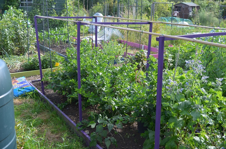 The plots and pots have been thoroughly soaked and pots grouped to try and reduce moisture evaporation. I haven’t managed to shade the greenhouse though and will try to bodge something together later today. Jetwashed the French beans again to reduce the amount of ruddy blackfly on them. This is turning into a regular thing. A cheery sight is that the Black Coco and Vermont Cranberry beans are both flowering – pink flowers on the first and white on the second.