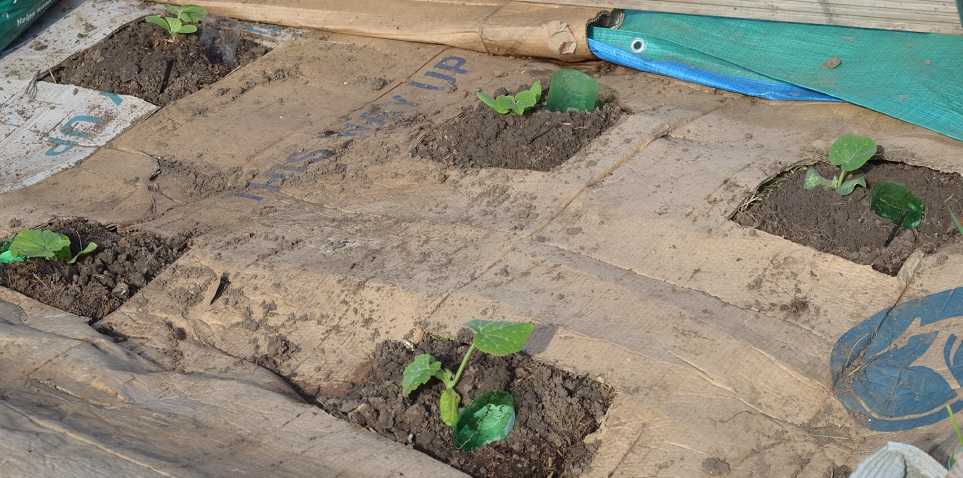 My last squashes are out – hurray!! – through holes in cardboard on plot 92 for relative