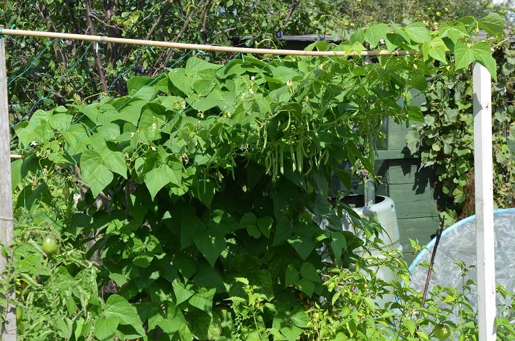 Also really going for it are beans. Becca the Wigwam is dripping with them, though she’s not the most practical shape for picking beans. I am particularly pleased with Sunny’s Aeron Star purple runners, because they are actually changing colour like they are supposed to. The ones I grew last year resolutely stayed green.