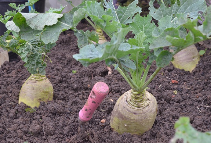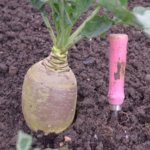 I’ve been trying, and failing, to grow a decent swede for 3 years. Usually I have to pick the whole crop to get scrapings for one meal. Not this year. The best performers this year are the Gilfeathers, which I got in last year’s A4A seed circle and are a cross between a swede and a turnip. They’ve grown into pretty hefty things – my handfork is there for scale. The ‘proper’ swedes aren’t as huge, but they do look like swedes should and are big enough to cook, rather than the small, twisted, spindly offerings (photo above right) I’ve previously managed.