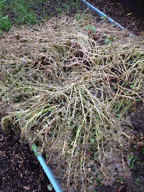 Those were pretty hard frosts. Anything that isn’t hardy has slumped, most noticeably the drifts of nasturtiums. And the oca. Last year it went down in stages, with the ‘killing frost’ around 7th December. This year it all came at once. After months as pillowy heaps of lemony leaves, it’s now just sad ribs and frost-blackened bits.