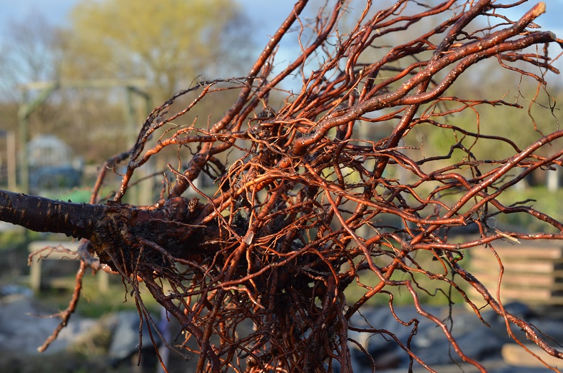 • bare-rooted & potted 2 red gooseberry plants for shifting elsewhere later in spring, likewise some of the strawberry plants from the bottom bed. In doing so, I learned that underground horsetail shoots are tiger-striped as well as black, and gooseberry roots are a glorious orangey red;