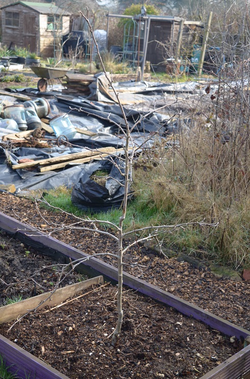 For a 6ft tree that’s been in for 2.5 years it had a very small root ball – even allowing for my having chopped through quite a bit. So I don’t think it much liked life over in boggy corner. I am anxious about its recovery – not just because of the apples, but also because it’s hosting part of my mistletoe experiment. For now it’s in a potato bag of compost, bonemeal and fertiliser, tethered to my Munty frame in lieu of a stake of its own. Fingers very much crossed.