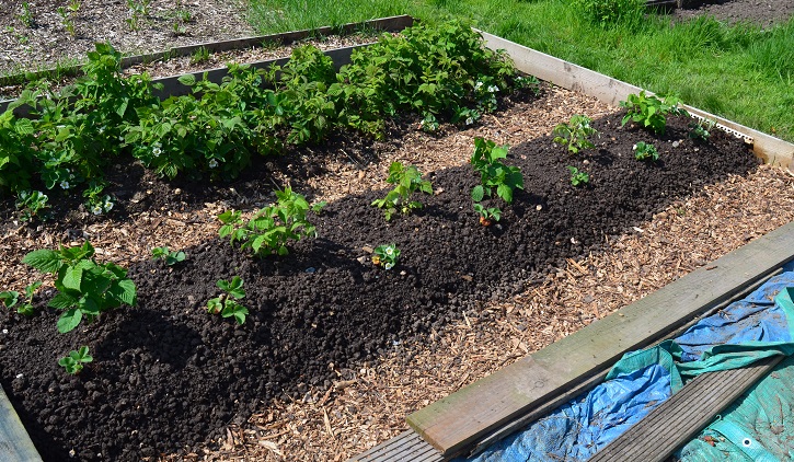 new raspberry bedThe new raspberry bed has taken well. Missing from the photo here is that the lovely berries are sharing space with turnips. Not quite in keeping with a fruit area, but they fitted in so neatly!
