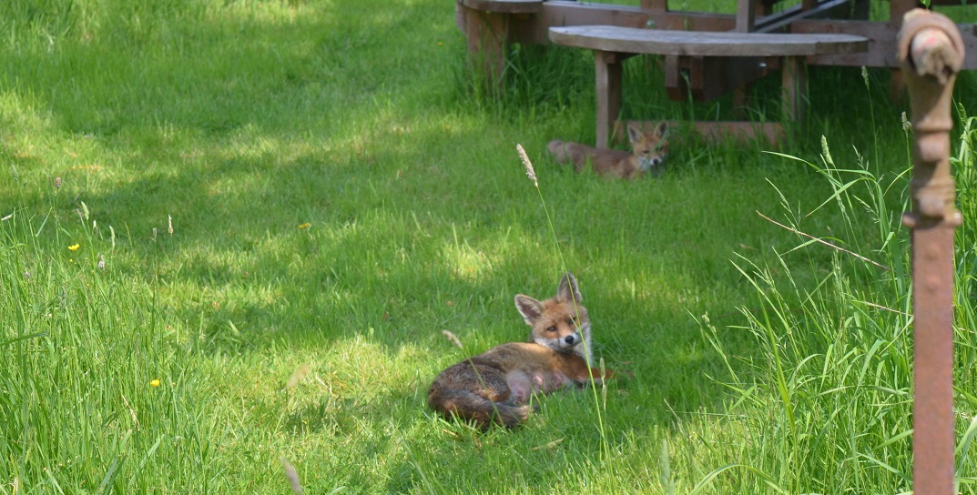 vixen and cubThe foxes are more than usually visible at the moment. They live in the brambles down by the apiary and this year have cubs. Two of them, which are all fluff and enormous ears at the moment. I’ve switched over to Growmore from BFB for a bit, as they seem fairly keen on digging. The picture on the left has the vixen at the front and one of the cubs under the picnic table. (as with all the pics, click on it for a bigger version)