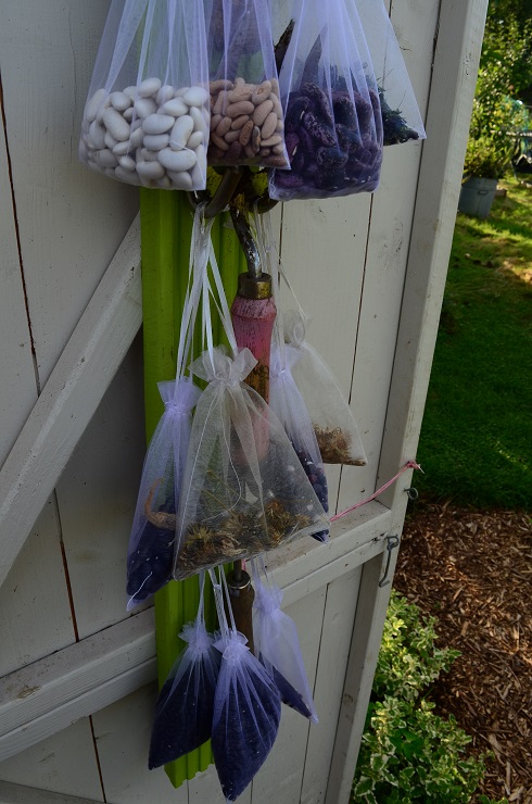 skirt-full-of-beansThis is seed-saving season. At this time of year a dress/tunic over jeans is my favourite plot-wear. Primarily because it makes a handy bag for bean harvesting, and for catching beans as you shell them. Which I could happily do all day – there is something incredibly satisfying about cracking open brittle pods and liberating shiny, rattly beans. shed-beansThe shed door is festooned with bags: Cherokee Trail of Tears, 2 types of runner, Black Coco, Purple Teepee, Inca Pea Bean (and its misbehaving sibling) and the beginnings of Monachelle di Trevio. I hope the latter haven’t crossed with the CToTs. I grew them next to each other, but they flowered at different times so I’m hoping it’s all ok. Still to come are the Cara la Virgen de la Bañeza León beans, or Caras, as that’s such a mouthful. They are prolific but also the very last bean to appear. Fingers crossed the rest of the month stays warm and dry (though not as hot as yesterday thankyouplease!).