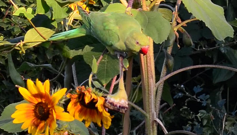 sunflower-thiefNot that there are many sunflowers left to be seen. The birds, and particularly the parakeets, are eating the heads as soon as seeds develop. They squawk indignantly and flap off when I get near (hence pixelly photo), but as Wendy’s got sunflowers next door they don’t have to go to much effort to continue their lunch.