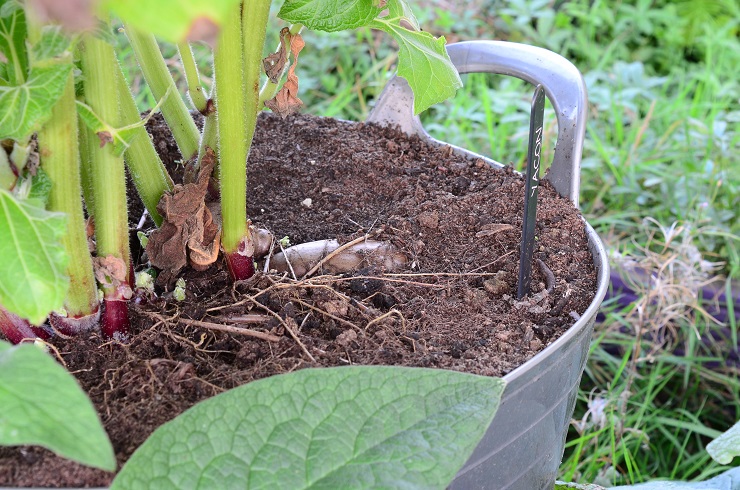 yacon-flowerI am getting really rather excited about the future yacon harvest. I can tell that tubers are starting to develop – not just because there’s one appearing near the surface but also the compost level in the pot has risen. yaconI planted the infant yacon with a good inch or two of space at the top of the pot. That space is long gone – compost is up to the edge of the pot and starting to spill over. It was fed today – surely it can’t get any bigger?! It’s also flowering away like mad, with sprays of little yellow flowers the bees seem to adore, echoing the sunflowers a few feet away.