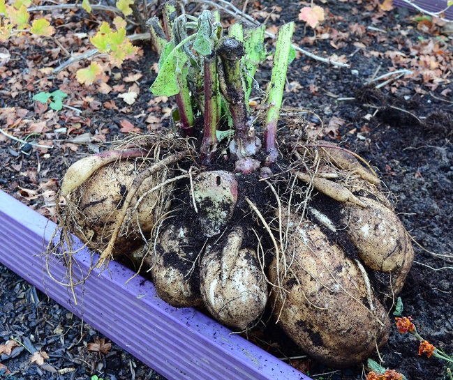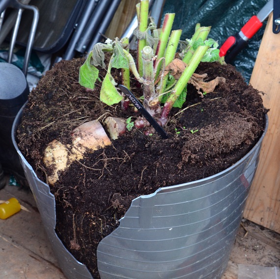 The result is…mindboggling! No wonder the compost was rising up and spilling over, the pot was rammed full of tubers the size of giant baking potatoes. Originally I had just under 40L of compost in the pot, planted with one small tuber. I think I have carted home about 5-6 kgs of tubers which we are going to have in salads, as crispy juicy snacks and boiled down into almost calorie-free sweet syrup, which is what made me want to grow yacon in the first place. The picture on the right below shows half of it – the others fell off while I was cleaning the compost away. If there are any other ways to use them, please do let me know!