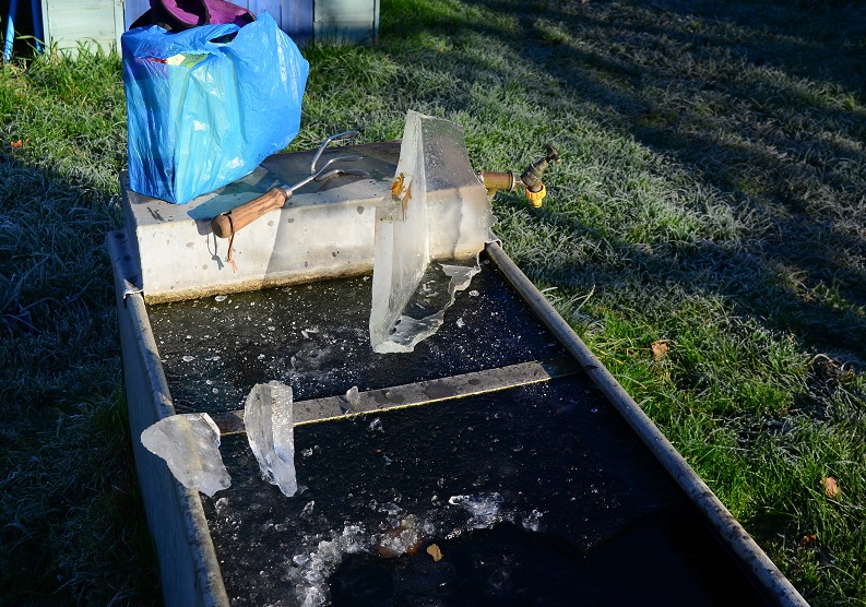 All the water is frozen. I feel very sorry for the birds and their hunt for water. I broke the ice for them on one of the dip-tanks – it’s an inch thick and took much bashing with a cultivator before I got through.