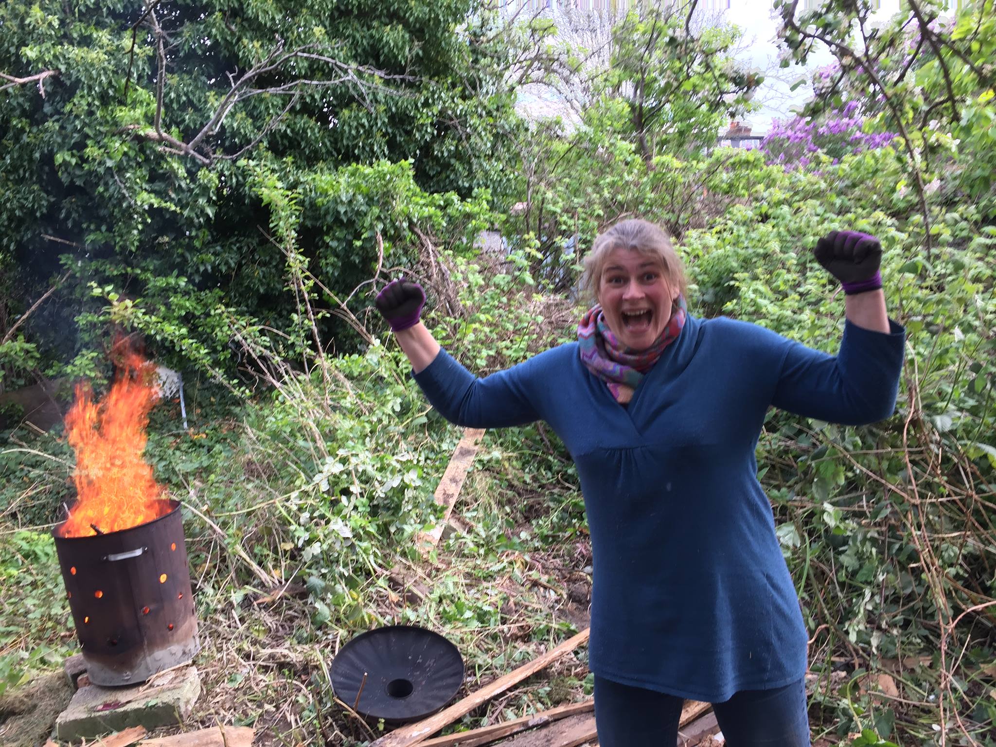 he tree growing in front of the garage blocking it in has obviously been there for a while. The brambles, holly, rubble, old kitchen, ivy-covered dead trees, nettles, diseased fruit trees all need removing so the neighbours stop fly-tipping and Catherine can create a small oasis. Note how tall the brambles are in the picture. I do love a bit of destruction. Our glee reached new heights when we remembered the previous owners left an incinerator…