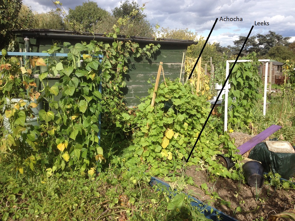 Despite falling over, the structure with achocha on is covered in fruits, so these will be coming home for dinner over the next couple of weeks. My leeks were next to them. I say were, because I am not sure how many will have survived an abrupt hug from an achocha trellis. Or the sudden leaping off a straw bale of 2 hefty potted aubergines.