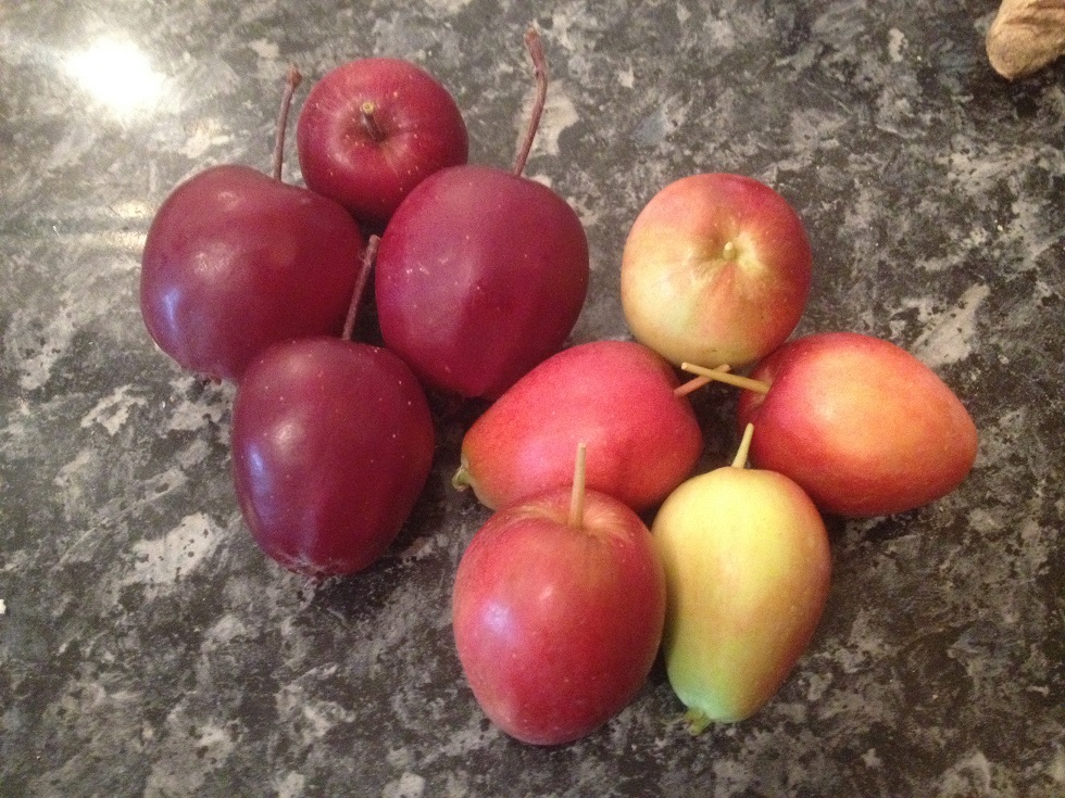 Although the medlars fell off the tiny tree and my peach has only ever been a bit of a twig, the Harry Baker crab apples came up trumps, with nearly a kilo of little, burgundy, red-fleshed apples. Andy Bees really kindly let me pillage his tree too, and I have a stack of fragrant spiced jelly (adapted recipe here) in the larder for winter.