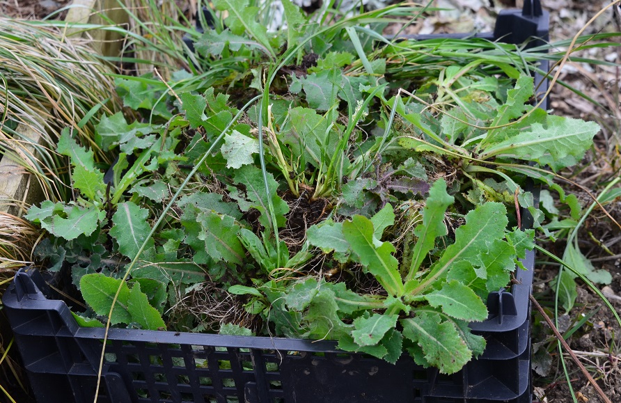 2. Saffron beds have been weeded and fed. Both beds had been colonised by much opportunistic and tap-rooted evil – thistley things and dandelions predominantly. The plus point of all the organic material I’ve added (compost, spent hops, manure) is that the soil is loose and fluffy and it is really easy to pull them out with that blasted tap root intact. Four gravel-trays-worth came out in the end – a very satisfactory result!