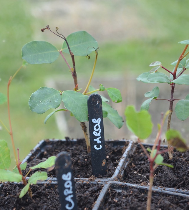 3. Carob. Ten of my twelve plants have survived winter in the most meagre of pots and have been potted on as a reward. They were attacked by an unidentified family of creepy crawlies, some of whom sewed leaves together in an effort to hide from view. It didn’t work. For year-old plants they aren’t very big at all – I know they are slow growing, and the tiny pots they were in can’t have helped. Hopefully their new roomy quarters and a scraping of food will encourage them to bigger and bulkier growth. Most carob varieties are dioecious, meaning plants are either male or female. Only a scant 5-6 more years to wait till they might start fruiting and I discover whether I have grown any useful female plants, or just a snoozy gentlemen’s club.